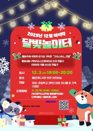 [한국강사신문 이미숙 기자] 부산광역시립해운대도서관(관장 노장석)은 12월 3일 오후 6시 해운대도서관 어린이실에서 유아부터 초등학교 3학년 이하 자녀를 둔 가족 10명을 대상으로 야간 독서 프로그램 ‘12월 달빛놀이터’를 운영한다고 밝혔다.이 프로그램은 평일 저녁 시간에 가족이 함께하는 독서 체험을 통해 가족 독서문화를 확산하고, 책을 매개로 한 소통과 정서적 유대감을 형성하기 위해 마련했다.프로그램은 ‘크리스마스, 연말’을 주제로 한 독서와 연계 체험 활동을 통해 가족이 함께 정겨운 연말 분위기를 느끼며 소통할 수 있도록 구성했