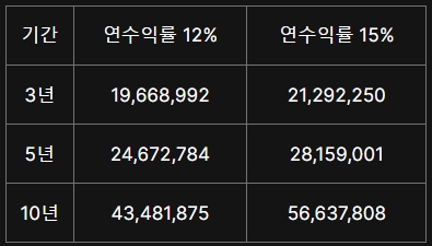 1,000만 원으로 4종목을 골고루 매수했다면, 1년 뒤 현재 1,400만 원이 된다. 이 돈을 그대로 재투자한다면 3년 후, 5년 후, 10년 후 얼마가 될까? 실현 가능한 수익률 중 12%와 15%로 시뮬레이션으로 예상해 본다.