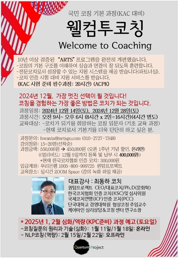 [한국강사신문 정헌희 기자] 오는 12월 14일(토)과 28일(토)에 걸쳐 최동하 코치가 진행하는 국민 코칭 기본 과정 ‘웰컴투 코칭’ 프로그램이 열린다. 교육대상은 코치가 되기를 희망하는 코칭 입문자, 기본기를 다지고 싶은 코치다. 오전 9시부터 오후 6시까지 줌으로 진행된다. 정원은 15~20명이다.