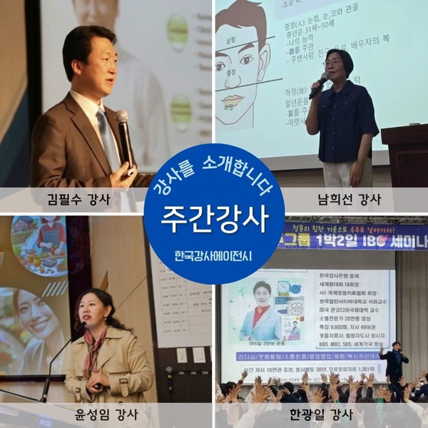[한국강사신문 정헌희 기자] 한국강사에이전시는 12월 1주차 주간강사를 소개했다. 이번 주 강사는 김필수, 남희선, 윤성임, 한광일이다.