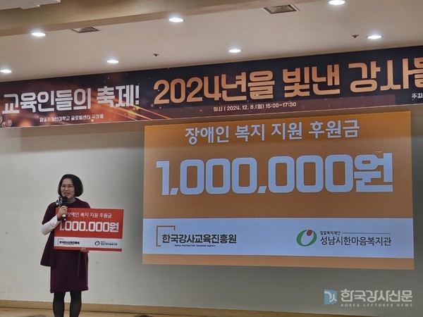 [한국강사신문 정헌희 기자] 한국강사교육진흥원은 가천대학교 글로벌센터 국제홀에서 8일 성남시 한마음 복지관에 장애인 복지 후원금을 전달했다.