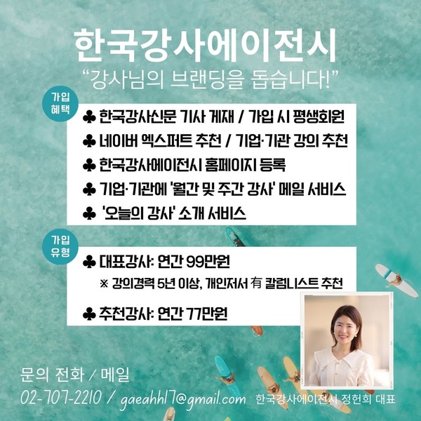 한편 회원 가입은 유료가입으로 진행되며, 대표강사, 추천강사로 등록이 가능하다. 자세한 사항은 한국강사에이전시 대표메일(gaeahh17@gmail.com) 또는 전화(02-707-2210)로 문의하면 된다.
