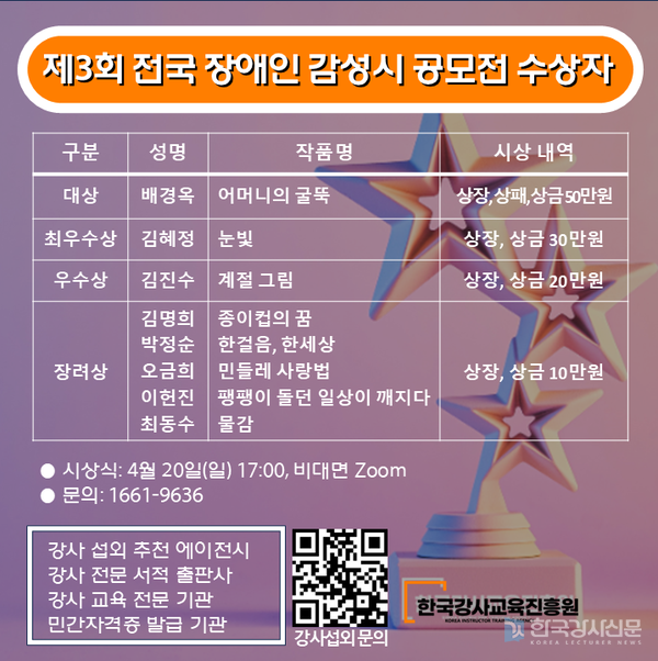 시상식은 오는 20일, 장애인의 날 17시에 한국강사교육진흥원에서 비대면 ZOOM으로 진행될 예정이다. 한국강사교육진흥원은 향후 매년 장애인 감성시 공모전을 추진하여 장애인의 감성과 창의력을 더욱 널리 알릴 계획이다. 장애인 감성시 공모전은 김순복 원장이 한국강사교육진흥원 회원들과 뜻을 모아 매년 진행하고 있다. 이번 공모전 후원자로는 김순복 원장, 강병찬 총괄본부장, 강연례 수석연구원, 권경희 수석연구원, 김성희 선임연구원, 이건우 선임연구원, 김선규 수석 위원, 허정아 수석 위원, 이도경 교육위원, 박기준 시인이다.