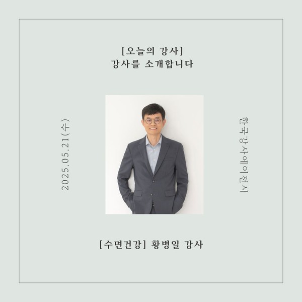 [한국강사신문 정헌희 기자] 5월 21일(수) ‘오늘의 강사’는 수면건강 분야 황병일 강사다. ‘오늘의 강사’는 한국강사에이전시가 지식뿐만아니라 선한영향력을 전하는 강사를 소개하기 위해 기획했다. 오늘도 강의 현장에서 청중과 소통하며 긍정의 에너지를 전하는 강사를 응원한다.