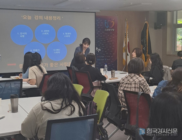 [한국강사신문 정헌희 기자] 성연미 아나운서는 지난 26일(월) 오전 10시 안양인재육성재단의 학부모 강사단 60여명을 대상으로 ‘전달력 높이는 발성과 화법’ 특강을 성황리에 마쳤다. 이번 특강은 학부모 강사단의 역량 강화 프로그램의 일환으로 마련됐다.