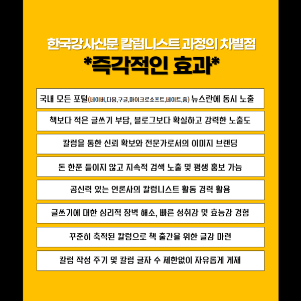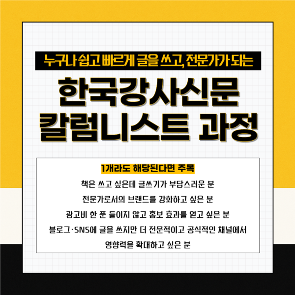 한편, 한국강사신문은 이번 과정을 통해 강사와 각 분야 전문가뿐 아니라 자영업자, 유튜버, 블로거, 일반인까지도 자신의 지식과 경험을 칼럼으로 발전시켜, 책 출간과 더 큰 영향력으로 이어가도록 지원할 계획이다.