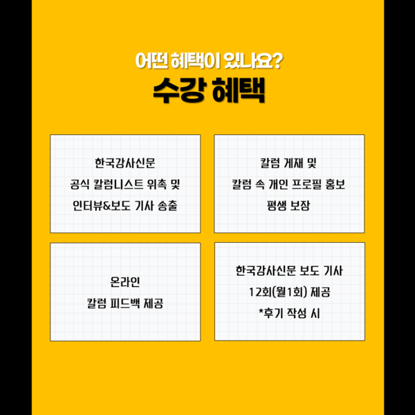 수강생에게는 ▲한국강사신문 공식 칼럼니스트 위촉장 수여 ▲인터뷰 및 보도 기사 송출 ▲칼럼 게재 및 칼럼 내 프로필 홍보 평생 보장 ▲보도 기사 12회(월 1회)제공 ▲온라인 칼럼 피드백 제공 등 다양한 혜택이 주어진다.