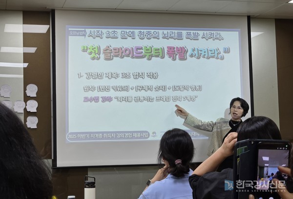 교육은 하나의 흐름으로 이어졌다. 주요 내용은 ‘강사의 첫걸음, 마인드와 기본소양’, ‘강의의 나침판, 강의계획서 작성의 모든 것’, ’AI 시대, 스마트한 교안 제작법’, ‘디지털 시대 강의법과 상호작용 기법’, ‘명강사 브랜딩 UP 전략’ 등이 진행됐다.