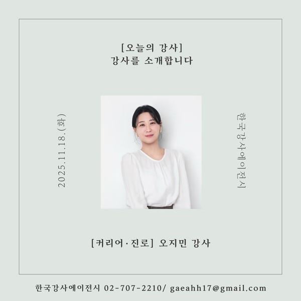 [한국강사신문 정헌희 기자] 11월 18일(화) ‘오늘의 강사’는 커리어 분야 오지민 강사다. ‘오늘의 강사’는 한국강사에이전시가 지식뿐만아니라 선한영향력을 전하는 강사를 소개하기 위해 기획했다. 오늘도 강의 현장에서 청중과 소통하며 긍정의 에너지를 전하는 강사를 응원한다.