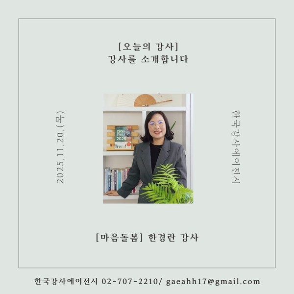 [한국강사신문 정헌희 기자] 11월 20일(목) ‘오늘의 강사’는 마음돌봄 분야 한경란 강사다. ‘오늘의 강사’는 한국강사에이전시가 지식뿐만아니라 선한영향력을 전하는 강사를 소개하기 위해 기획했다. 오늘도 강의 현장에서 청중과 소통하며 긍정의 에너지를 전하는 강사를 응원한다.