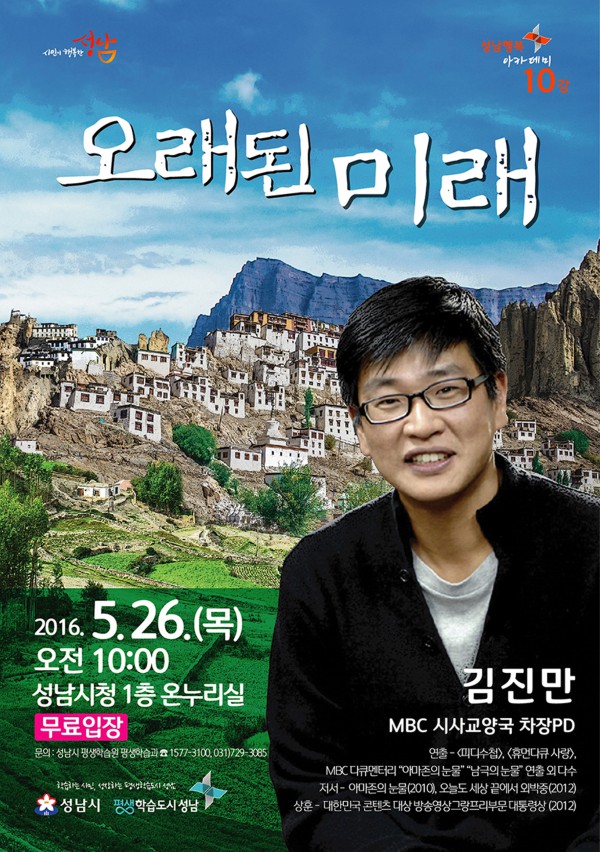 [한국강사신문 한상형 기자] 성남시(시장 이재명)는 MBC 시사교양국 김진만 PD를 초청해 오는 5월 26일 오전 10시부터 11시30분까지 시청 온누리에서 성남행복아카데미 10강을 연다고 24일 밝혔다.