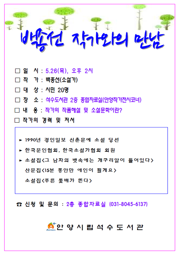 [한국강사신문 김장욱 기자] 안양시 만안구(구청장 민수기)는 26일 14시부터 16시까지 석수도서관 2층 종합자료실 내 안양작가전시 코너에서 ‘백종선 작가와의 만남’을 개최한다고 23일 밝혔다.