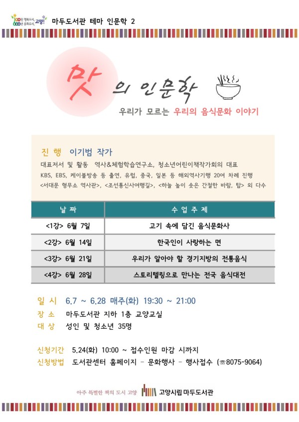 [한국강사신문 김장욱 기자] 고양시(시장 최성) 일산동구 마두도서관은 오는 6월 7일부터 테마 인문학 프로그램 ‘맛의 인문학 우리가 모르는 우리 음식문화 이야기’를 운영한다고 24일 밝혔다.