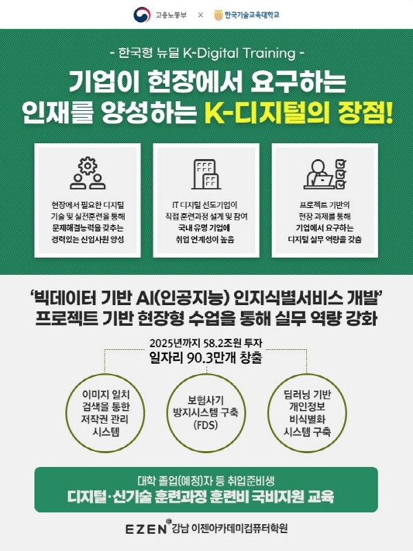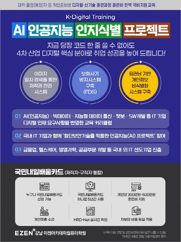 한국형 뉴딜 K-Digital Training(케이 디지털 트레이닝) <빅데이터 기반 인공지능(AI) 인지식별서비스 개발> 교육과정으로 강남 이젠아카데미컴퓨터학원에서 국민내일배움카드 국비지원 교육이 가능하다.